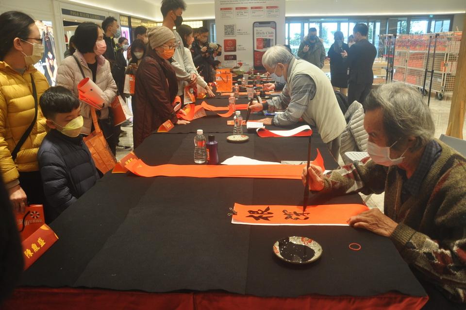 到場索取春聯的民眾可以自由選擇自己喜愛的四字春聯、對聯、字畫等,再請擅長書寫行書、隸書、草書、篆書等不同字體的書法大師們現場揮毫,撰寫各式吉祥話,客製化獨一無二的新年春聯帶回家。