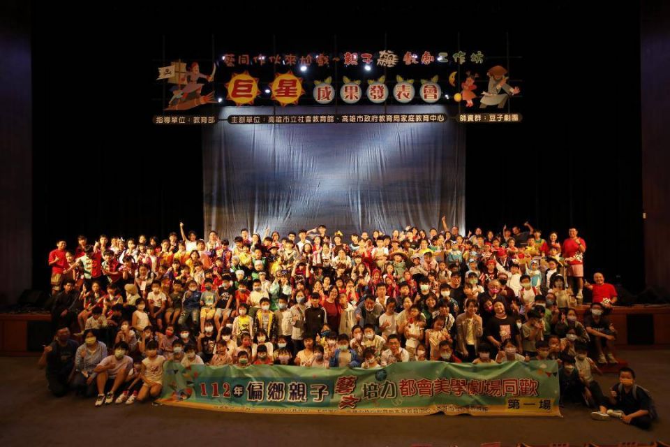 (記者李靜音/高雄報導)高雄市立社會教育館、家庭教育中心和豆子劇團聯袂打造暑假重頭『戲』~「藝同作伙來尬戲.親子飆戲劇工作坊巨星成果發表會」,126名素人親子學員歷經緊湊又充實的戲劇課程洗禮後,今(20)日以巨星之姿閃耀登上社教館演藝廳專業劇場舞台,親子同台尬戲飆演技,精彩呈現5齣創意好戲,學員們戲劇魂上身,生動又自然的演技,讓現場逾千觀眾用最熱烈的掌聲肯定回應。社教館館長沈坤佑、教育局家庭教育中心主任林詩隆等人到場給演出的小朋友最棒的鼓勵。