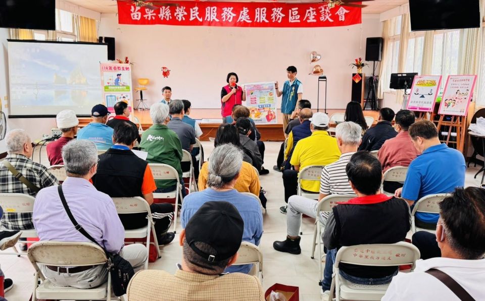 (記者鍾盛增/苗栗報導)苗栗榮服處於竹南鎮博愛公園活動中心舉辦服務區座談,邀請竹南、頭份等鄉鎮榮民眷及二類退除役官兵,期間竹南鎮衛生所黃莉雯護理長、苗栗縣長期照顧中心張韻儀、鄭家如照顧專員、科林公司張采臻、陳筠云聽力師、新竹榮家張惠慈輔導員及雪中送炭關懷協會苗栗分會吳光祐分會長、陸海空軍常備士官班相互關懷協會苗栗分會黃幸一分會長等共襄盛舉。會場播放廉政宣導「蔥花麵包的滋味」微電影,消費者保護宣教等;另設置就業、就養、就醫及助聽器維修保養等外展服務櫃台,貼心服務榮民先進。