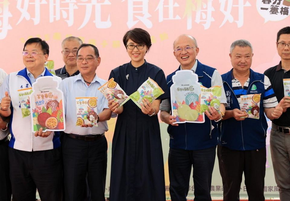 水里農會新品發表--百香果X麝香白葡萄蒟蒻C凍,許淑華縣長與貴賓共同為其代言。(圖/記者謝新鈕攝)
